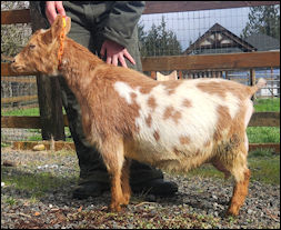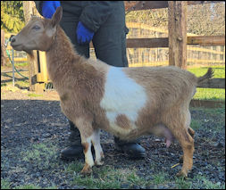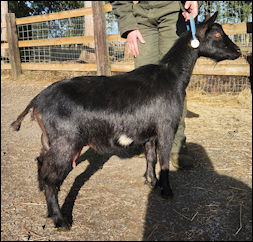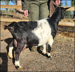 Bessie has been a herd favorite her whole life with everyone who has spent time helping care for the herd. She has a loving, smart, mischievious temperment, and the easiest mammary to milk. A very good friend, appraiser, and respected breeder once looked askance at this excessively tubular dairy little doe and asked why she was in the herd when she obviouslu doesn't fit my normal type. Everyone present, from my husband to team of interns jumped to Bessie's defense with shocking vehemence! Beyond being a joy to own and joy to milk (seriously, if I only kept one nigerian for home milk - it would be Bessie!), she has the most correct rump structure in the herd, and excels her herdmates in length and openness of bone pattern. If i coulld just get kids out of her that weren't little imps and trouble makers I would keep them all!
